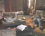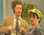 | Don and George Played by Jack Docherty and Moray Hunter These were a couple of men that shared a flat together, George Mc Diarmid had glasses but with one of the lens frames turned vertical. They used to discuss odd subjects, Their 'flat' did not have a lot of furniture in it, and it was littered with slogans such as "NO WASPS" & "Back to Falkirk". They had a mirror above the fireplace that was faulty in that it kept showing reflections of its previous owners. They had a brush with the law when they were caught speeding in Don's new car which was in the living room. They travelled at 1/2 mile an hour in a 3/8th Mile an hour speed zone. Character quote: |
